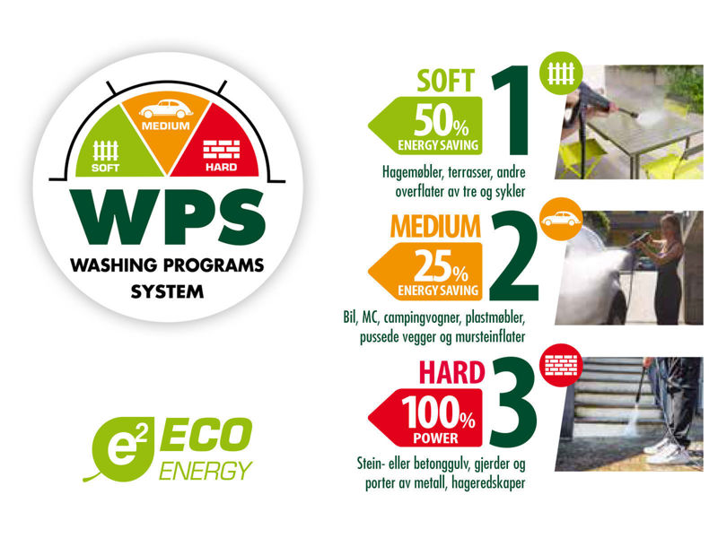 Meget kraftig og mobil høytrykksspyler med en ytelse på hele 160 bar og som gir en vannmengde på 8,0 l/min. Modellen har et patentert vaskeprogramsystem WPS (Washing Program System) og gir deg det mest egnede vaskeprogrammet for hver rengjøringsoppgave. Velg blant de tre vaske-programmene SOFT, MEDIUM og HARD. Da er du sikker på at trykk og vannmengde passer til vaskejobben du skal utføre: SOFT: Hagemøbler, terrasser og andre overflater av tre, sykler MEDIUM: Biler, motorsykler, campingvogner, plastmøbler, pussede vegger, mursteinsflater HARD: Stein- eller betonggulv, metallrekkverk, gjerder og porter, hageredskaper Vaskeprogrammene er optimalisert med tanke på trykk, levert vannmengde og driftsøkonomi. SOFT og MEDIUM sparer strøm og vil forlenge høytrykksspylerens levetid. HARD gir deg maks kraft når du trenger det! Nedfellbart teleskophåndtak og praktisk bærehåndtak i front gjør det enkelt å transportere høytrykksspyleren. Store hjul med gummibelegg sørger for at spyleren står stødig på alle underlag og gjør samtidig at den er enkel å flytte på. Pumpen i denne modellen har tre stempler, pumpehode av aluminium og har innebygd omløpsventil. Den har roterende av/på-bryter, samt automatisk start-/stopp-system som styres fra pistolgrepet. Høytrykkslangen kobles raskt og enkelt til pistol og høytrykksspyler med hurtigkoblinger. Lansen er utstyrt med hurtigkobling, noe som gjør bytte mellom det ulike tilbehørene raskt og enkelt. Slangespole for oppbevaring av høytrykksslangen når den ikke er i bruk. Utstyr og tilbehør som pistolgrep, lanse, dyser og såpebeholder har egne oppbevaringsplasser på vaskeren. Den er også utstyrt med en bred krok på baksiden hvor du kan henge ledningen ved lagring. høytrykksspyleren leveres med høytrykksslange på 6 meter, pistolgrep med låseknapp, terrassevasker med forlenger, justerbar såpebeholder som festes til lansen, høytrykksdyse med Variojet, dyse med justerbar viftestråle, turbodyse og vannfilter for vanninntak.