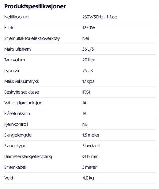 Støvsuger som suger både vått og tørt, samt har blåsefunksjon. Robust tank i slagfast plast. Leveres komplett med 1,5 meter sugeslange, plast sugerør, gulvmunnstykke, fugemunnstykke, støvpose og våtfilter.