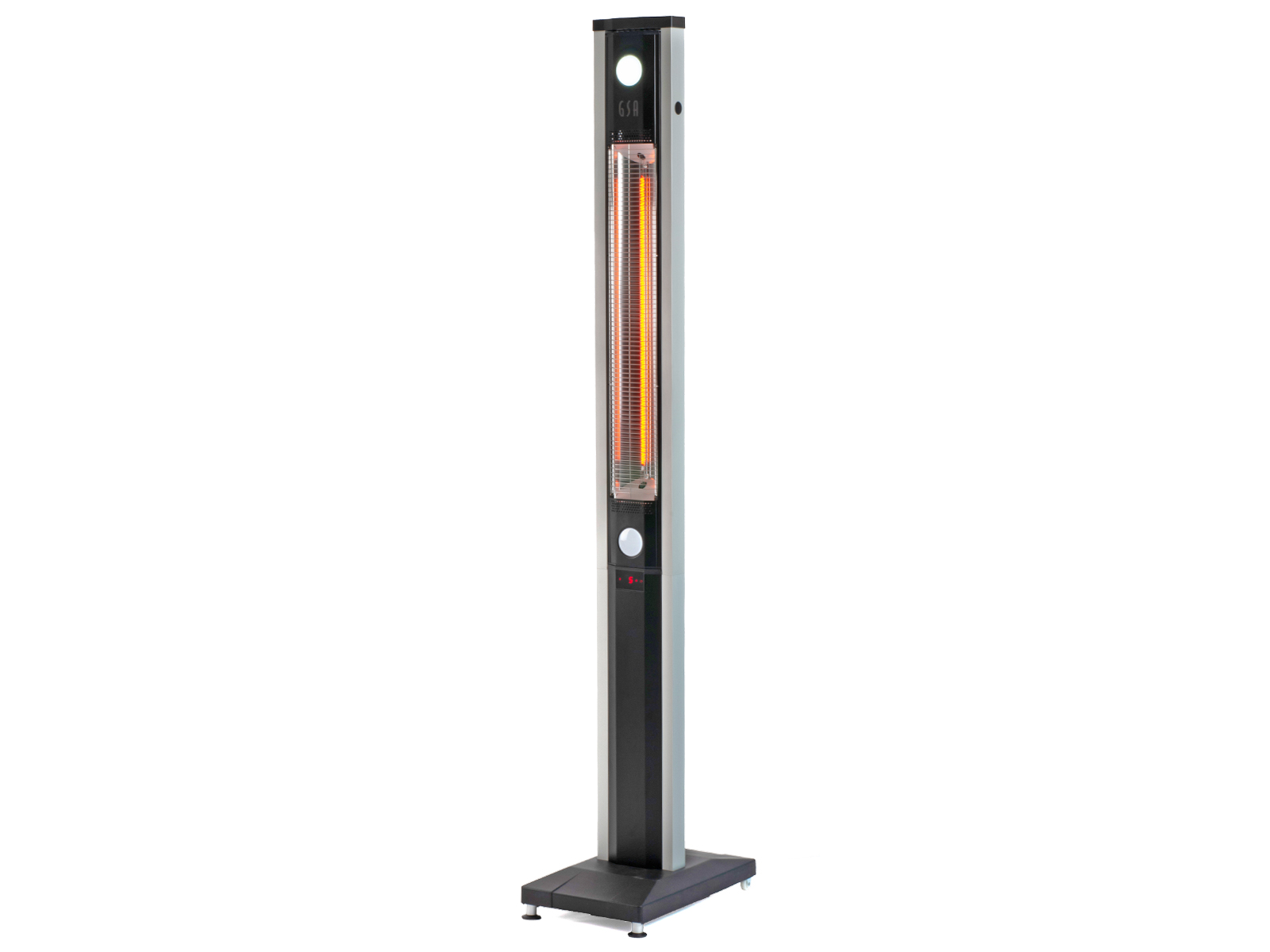 Sokkelen er utstyrt med 2 føtter og 2 hjul – noe som gjør det enkelt å flytte med seg varmeren fra hagebordet til sofagruppen. Med beskyttelse klasse IP34 tåler den bruk i lett regnvær. I tillegg er den utstyrt med veltesikring som slår av terrassevarmeren om den skulle velte.