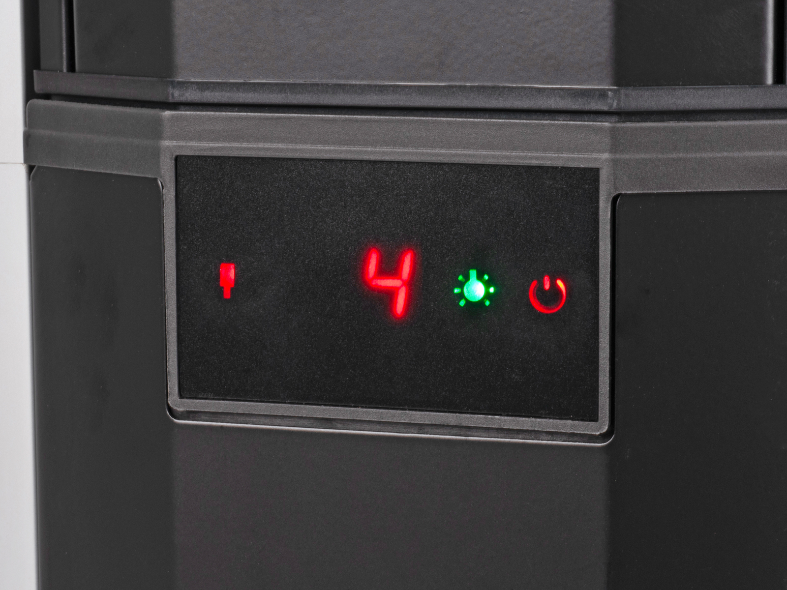 Terrassevarmeren har 5 varmetrinn (600/800/1300/1700/2200W) og maks. effekt er 2200W. I tillegg er den utstyrt med 2 LED-lys som sitter i hver ende av varmeelementet. Begge LED-lysene kan slås av og på hver for seg når varmeren er i horisontal posisjon. I stående posisjon lyser det øverste LED-lyset. Slå på hoved-bryteren på selve varmeren og den kan enkelt styres med fjernkontrollen – både styrken på varmerøret og om LED-lysene. Innstillingene du har på fjernkontrollen finner du også igjen på displayet på selve terrassevarmeren. Batterier til fjernkontrollen (2xAAA) følger ikke med.