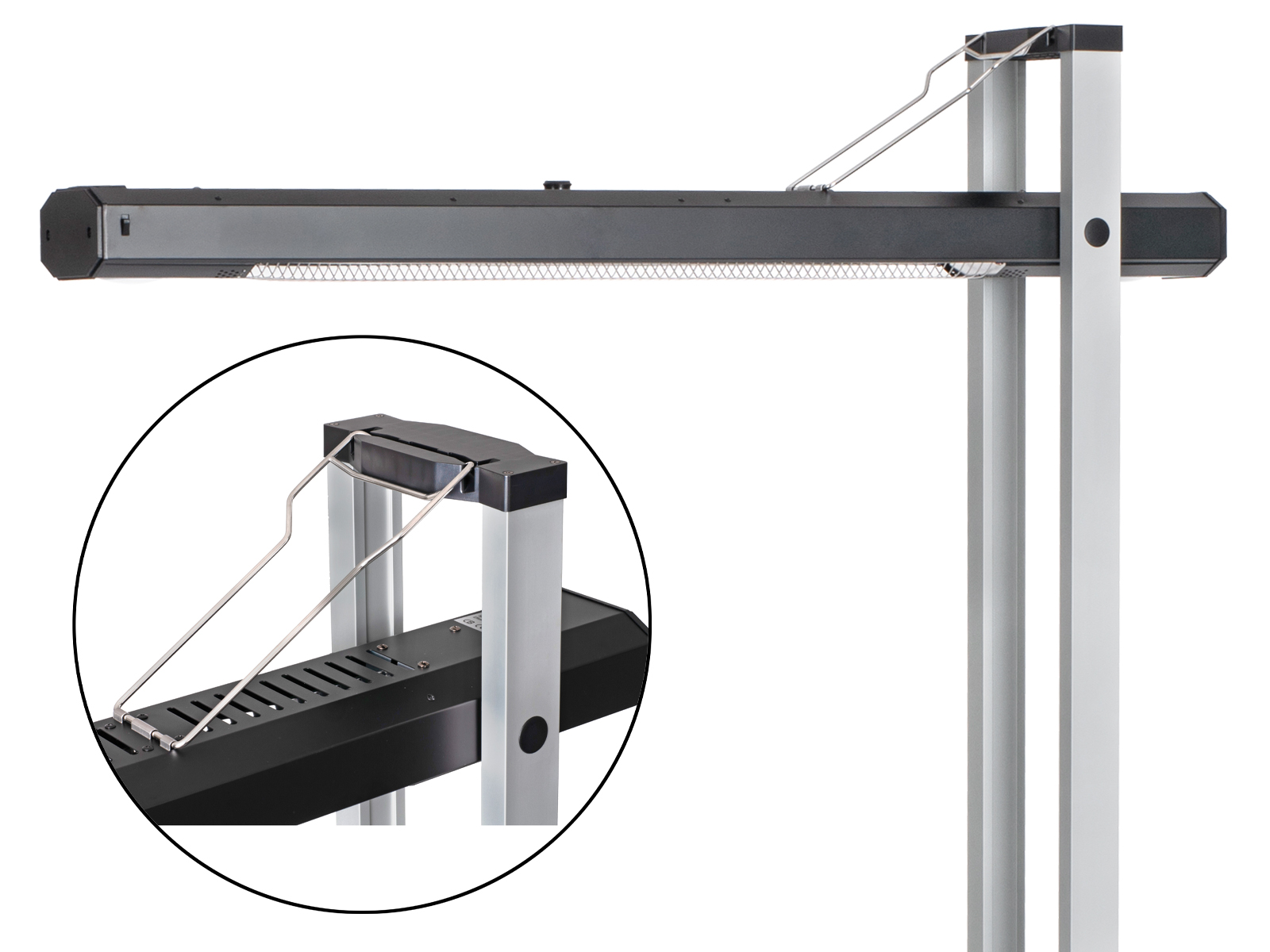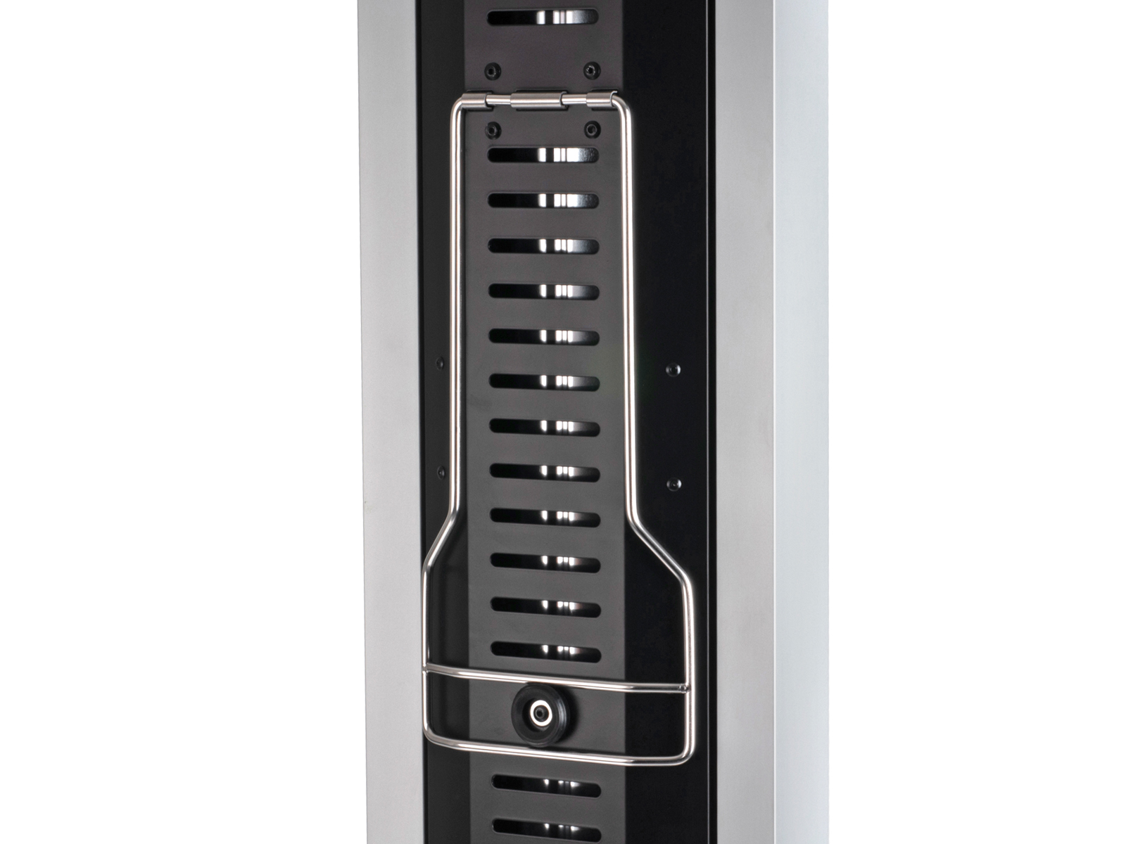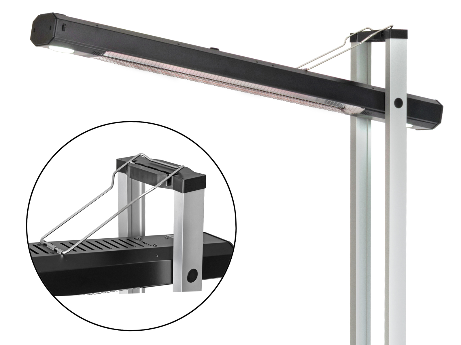 En lekker, infrarød terrassevarmer med flere valgmuligheter og innstillinger. Du kan velge å bruke den vertikalt som en varmesøyle eller du kan løse ut varmeelementet og vippe dette horisontalt, slik at varmen kommer ovenfra. Varmeelementet justeres enkelt ut ved å løse ut 2 låseklips, vippe varmeelementet opp horisontalt og feste dette med bøylen som ligger innfelt i elementet.