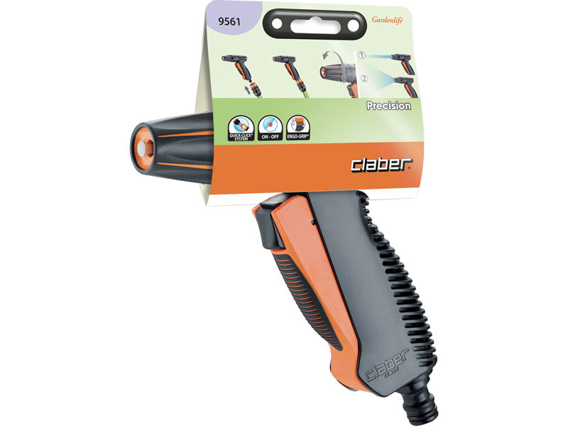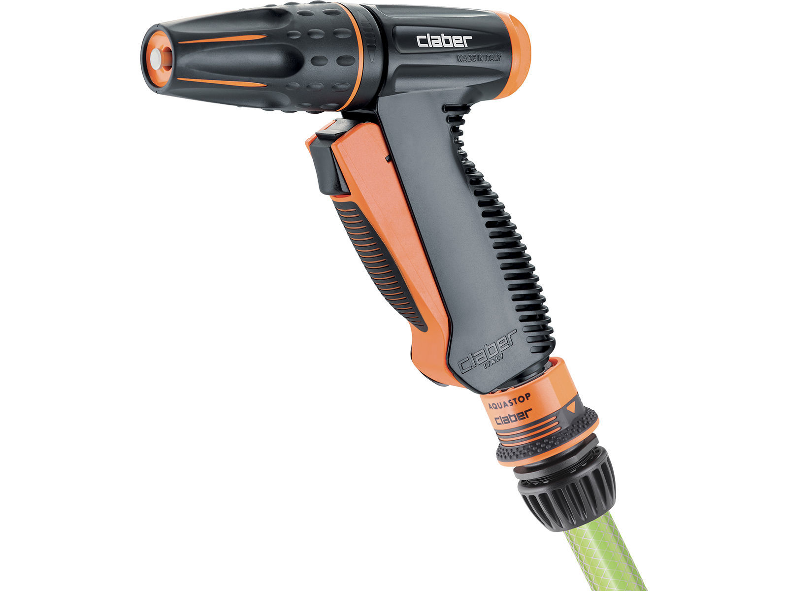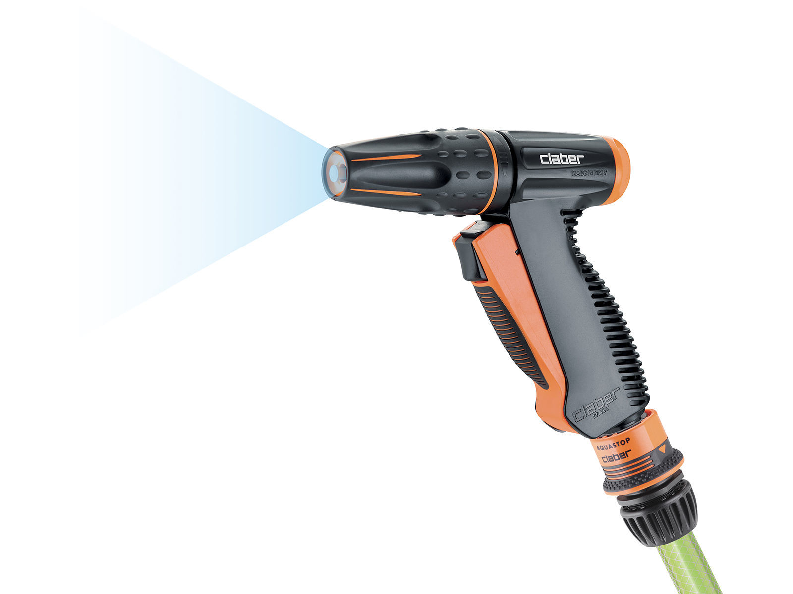 Vanningspistol av høy kvalitet med anatomisk gummigrep. Den bakre trykknappen lar deg slå vannet av eller på med en finger, og du kan også justere vannstrømmen med bare en hånd. Strålen reguleres ved å skru på dysen, fra helt lukket og konsentrert stråle til helt åpen som gir dusj-funksjon.