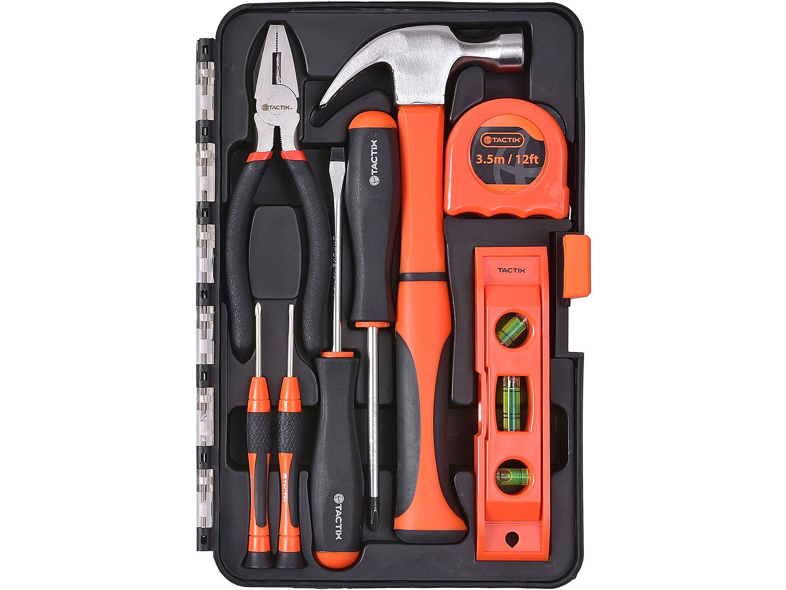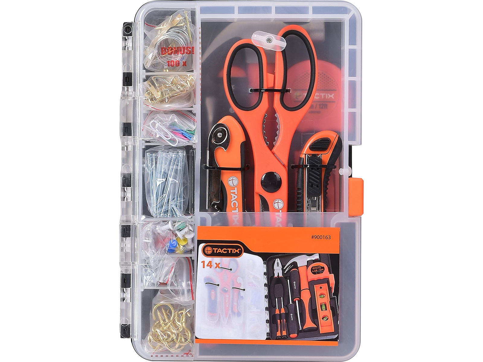 Innholdsrikt og praktisk verktøysett med det viktigste av verktøy for de små jobbene hjemme. Skal du henge opp et bilde, feste et håndtak, slå inn en stift eller sjekke lengden på kjøkkenbordet - da har du verktøyene for hånden. Til tross for at det er innholdsrikt tar det ikke større plass enn at du kan oppbevare det i kjøkkenskuffen. Settet inneholder et assortert utvalg av stifter, kroker, binders og opphengsbeslag. I tillegg finner du følgende verktøy:
