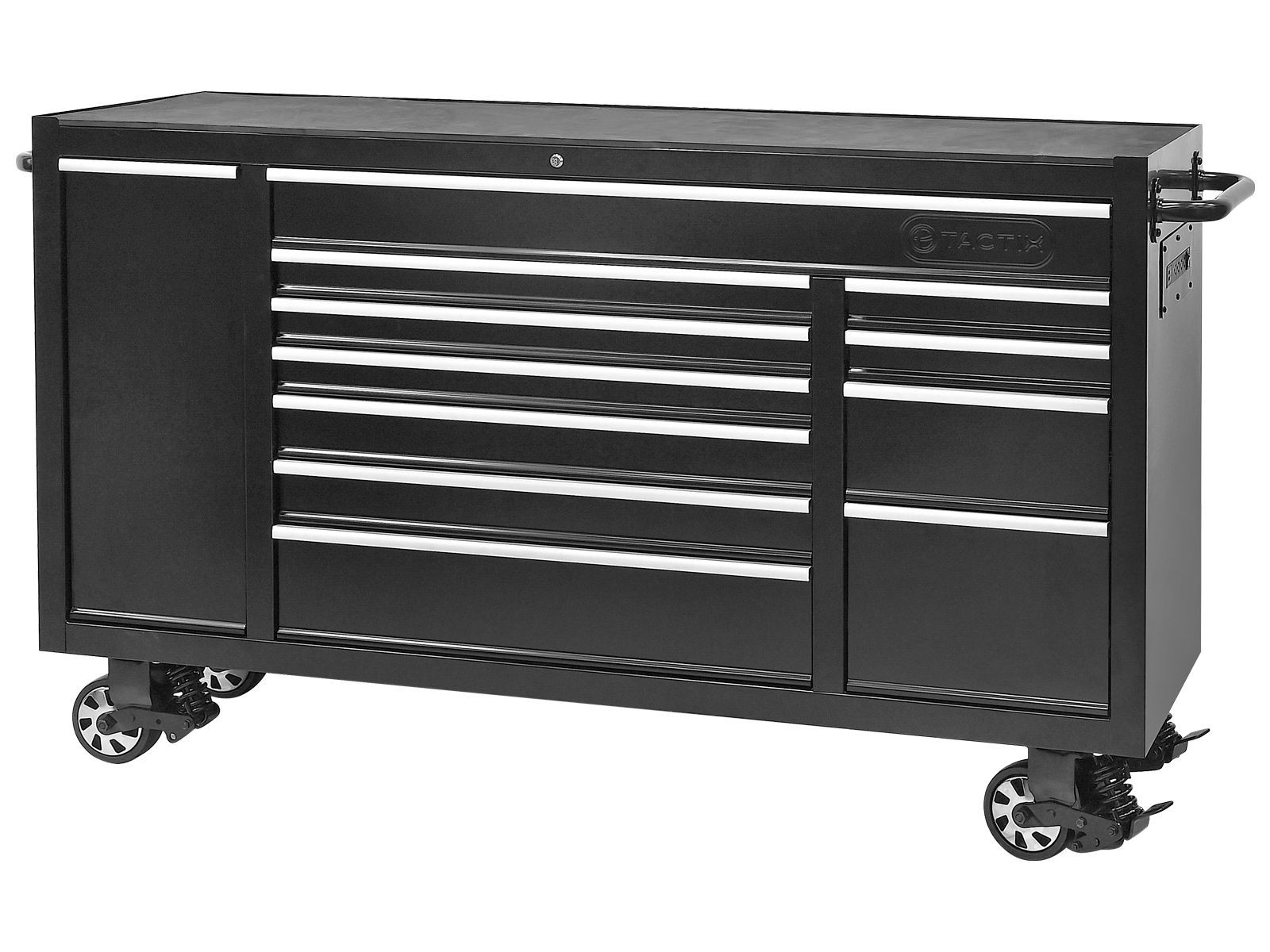Verktøyvognen har både faste hjul og hjul med brems; hvert hjul tåler en belastning på opptil 450 kg. Et solid sidehåndtak gjør det enkelt å flytte med seg verktøyvognen ved behov.